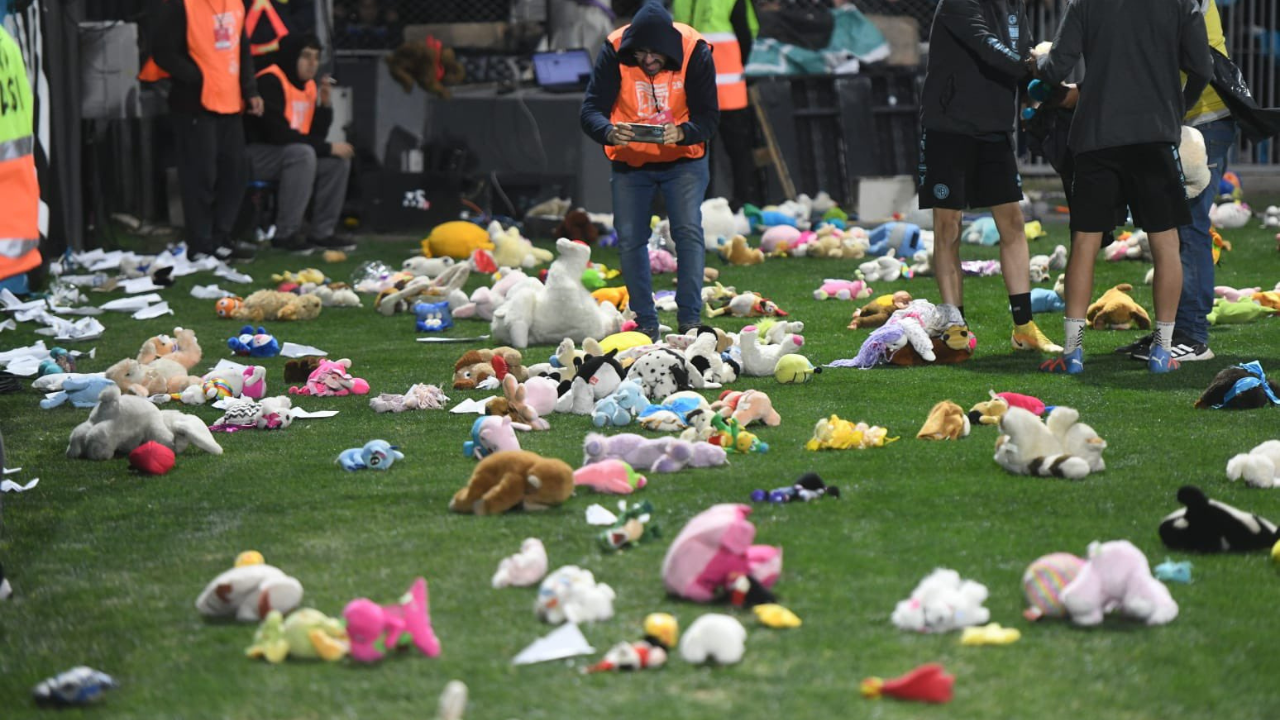 Durante el entretiempo del partido entre el Pirata y Estudiantes de La Plata, desde distintos sectores del Gigante de Alberdi comenzaron a caer ositos de peluches.