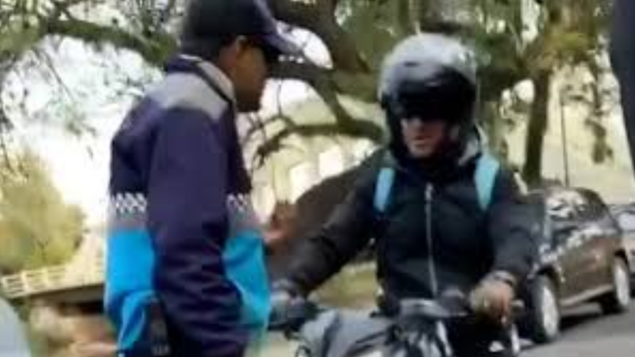 El inspector paró al motociclista que cometió la infracción pero quiso escapar y el agente obstruyó su paso para no dejarlo huir. La moto circulaba sin patente y le exigió que presente los papeles aunque de mala manera.